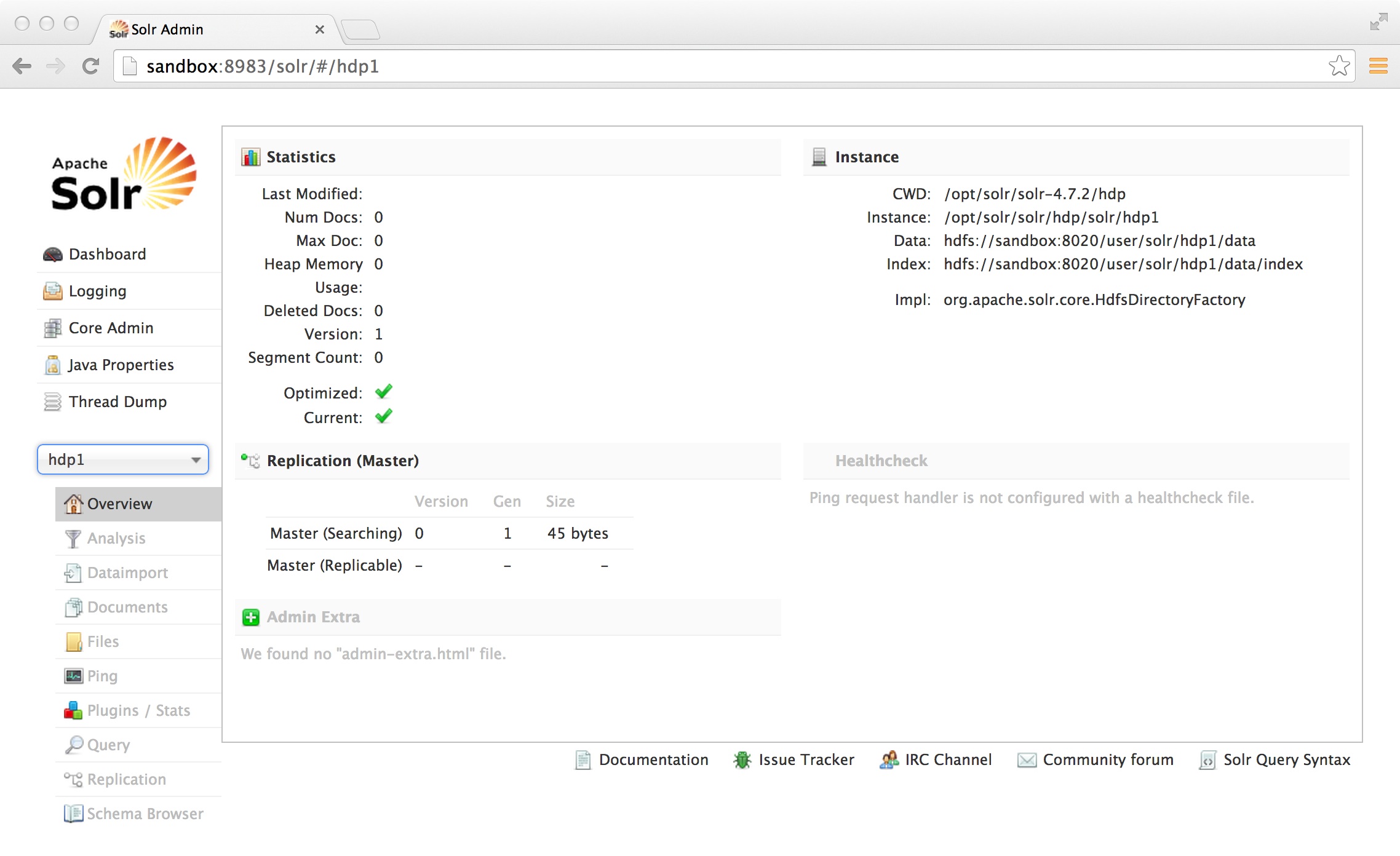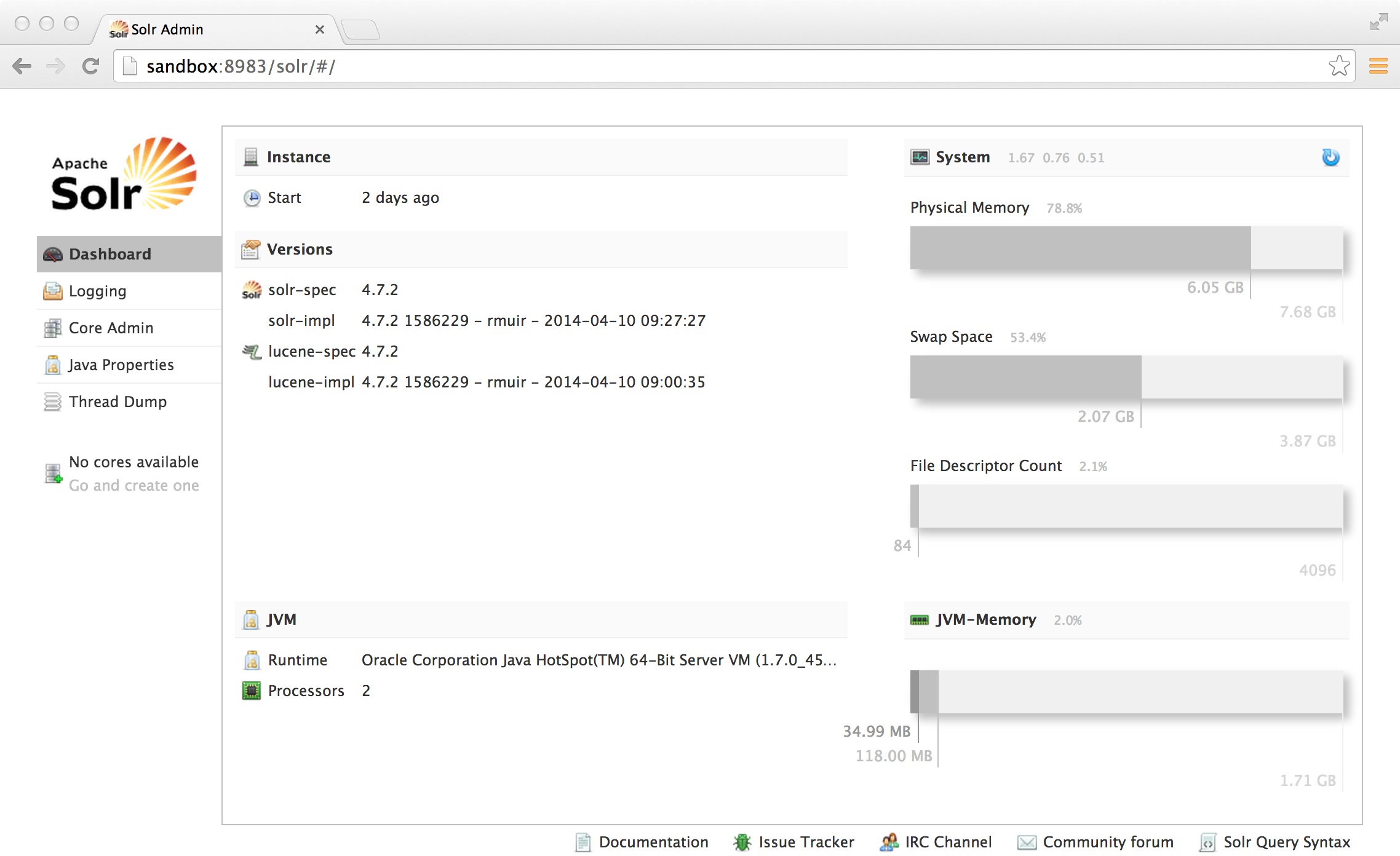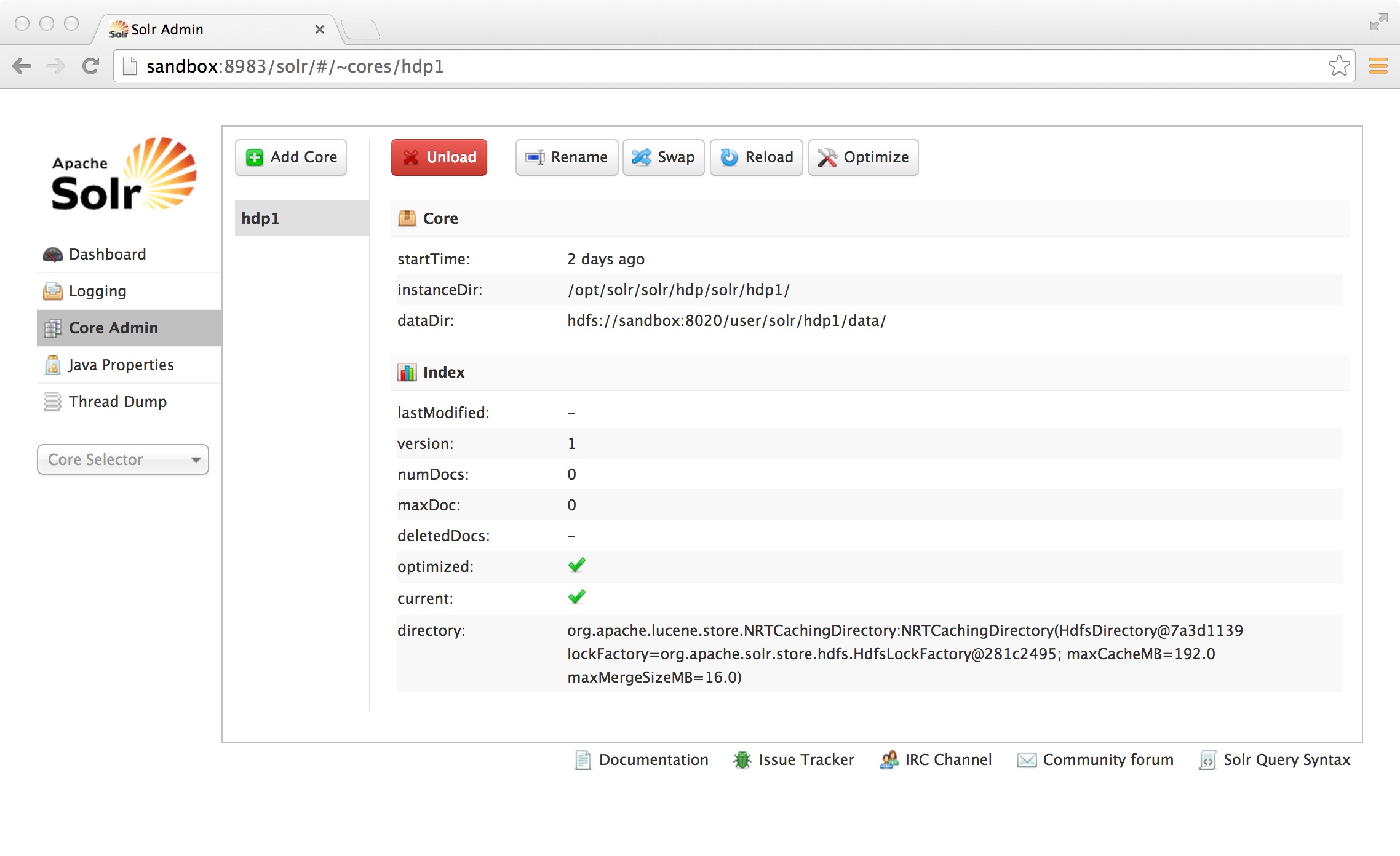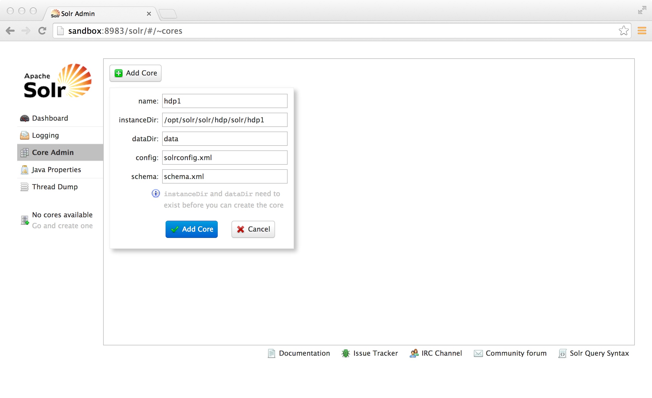 Now we need to create our core/index. Start solr and point your browser to it (http://sandbox:8983/solr):