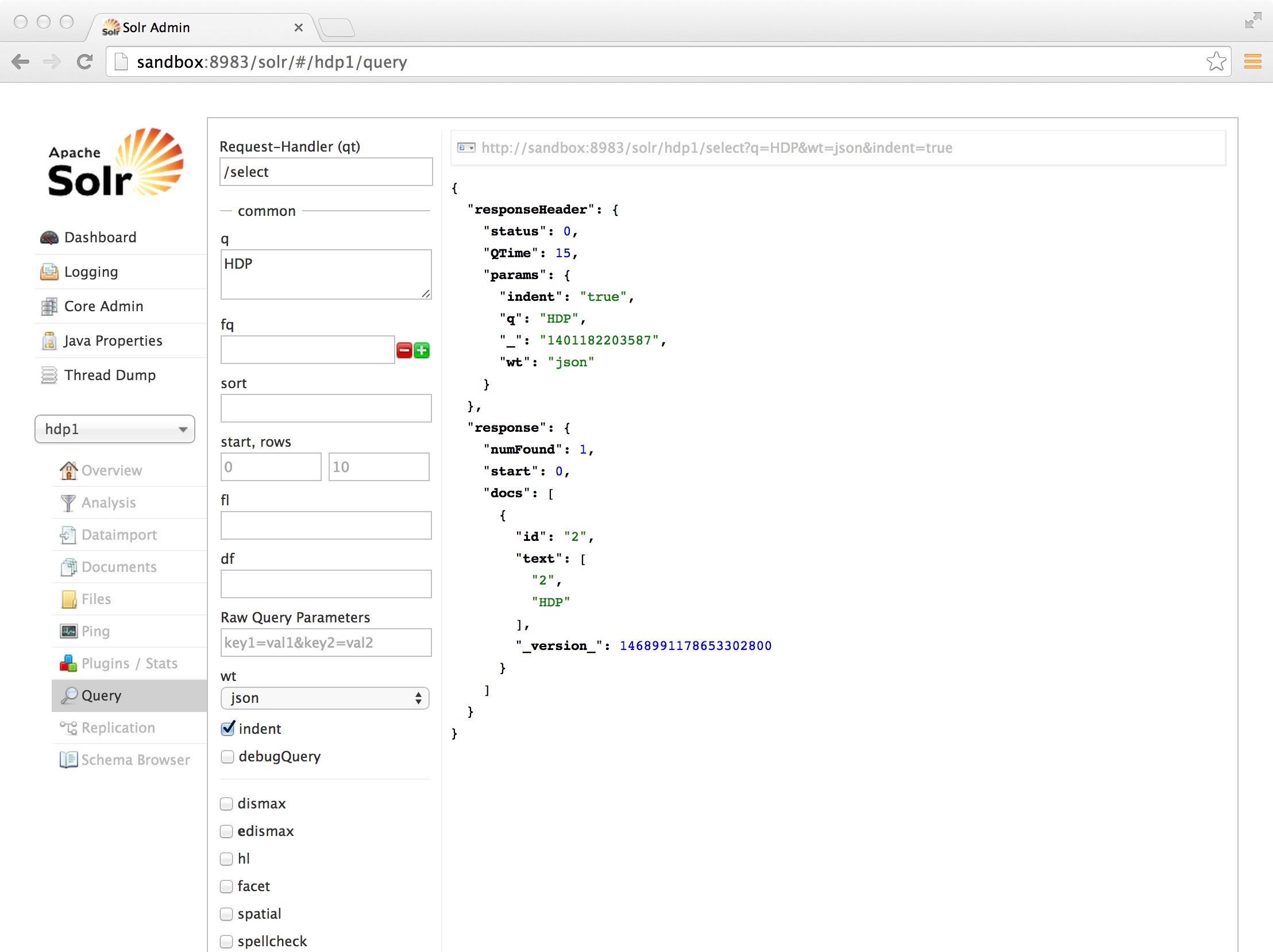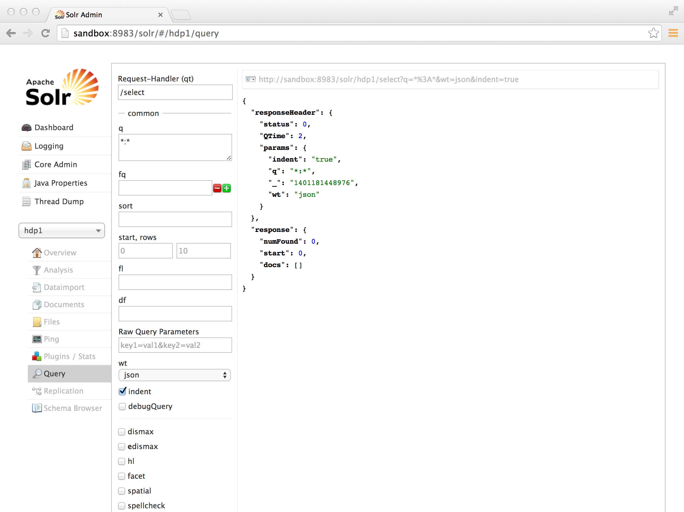 Remarks: I was using VMware’s Fusion to run Sandbox. If you choose Virtualbox things should look the same beside the fact your VM will not have it’s own IP address but rather Solr listening on 127.0.0.1. For convenience I added sandbox as a host to my /etc/hosts file on my Mac. Apache Solr 4.7.2 is the officially by Hortonworks supported version as I’m writing this (May 2014).